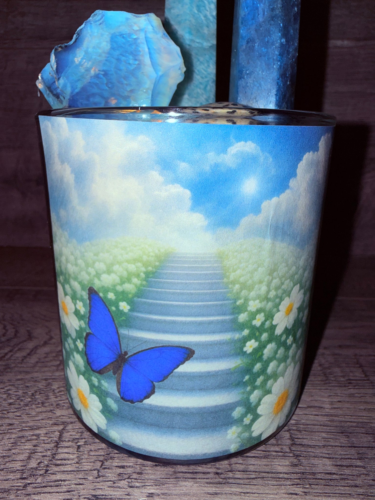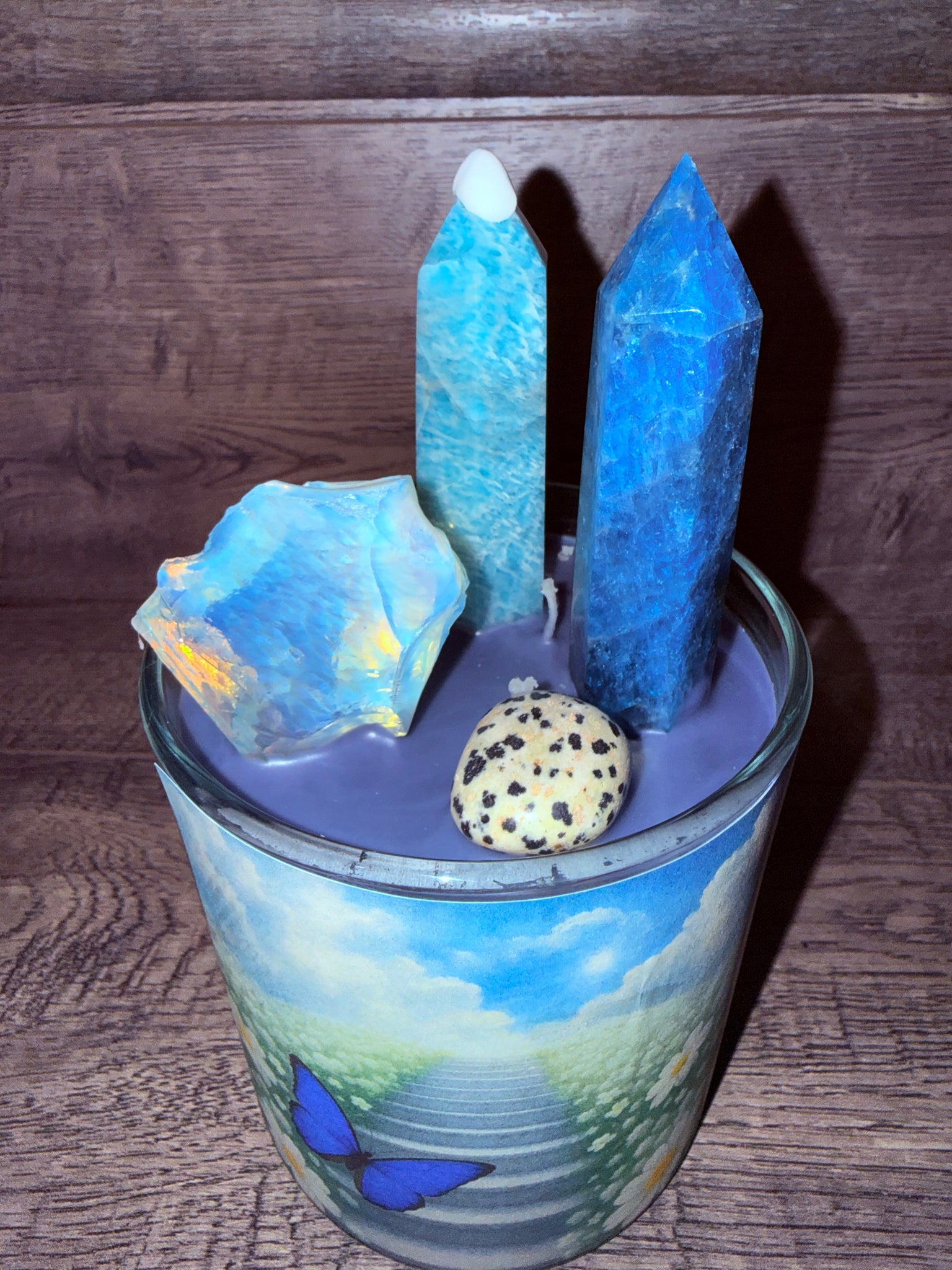 Infused with Amazonite, Blue Apatite, Opalite, and Dalmation Jasper, this candle harmonizes soothing water energy with vibrant earth frequencies empowering you to speak your truth, clarify your path, embrace smooth transitions, and find joy in your evolving journey.