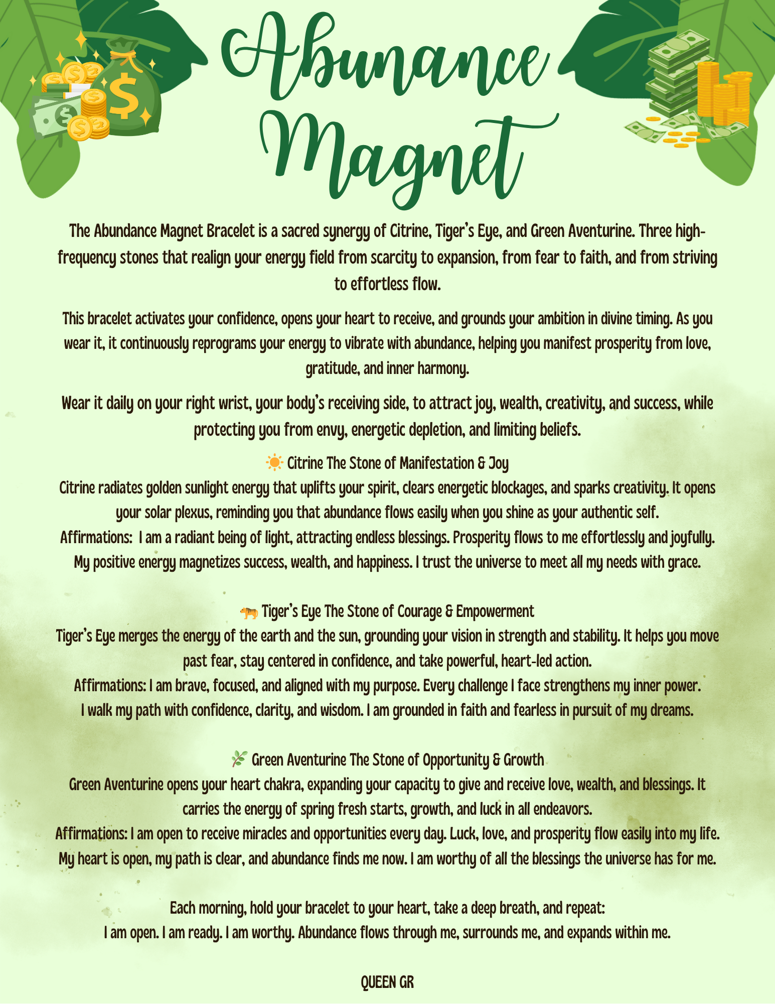 This bracelet activates your confidence, opens your heart to receive, and grounds your ambition in divine timing. As you wear it, it continuously reprograms your energy to vibrate with abundance, helping you manifest prosperity from love, gratitude, and inner harmony.