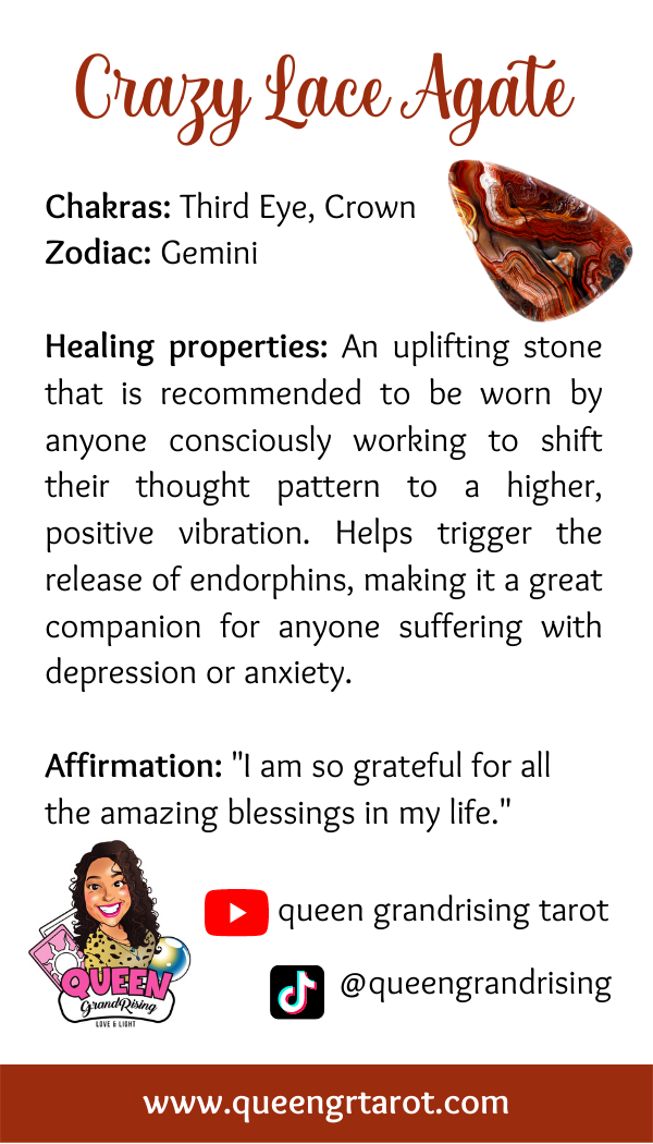 Crazy Lace Agate is a powerful stone for joy, stability, and emotional resilience. It works through the Solar Plexus and Third Eye Chakras, grounding you in confidence while expanding your perspective. Known for dispelling fear and emotional tension, this stone helps you embrace the chaos of life with humor, grace, and strength. 💫😄