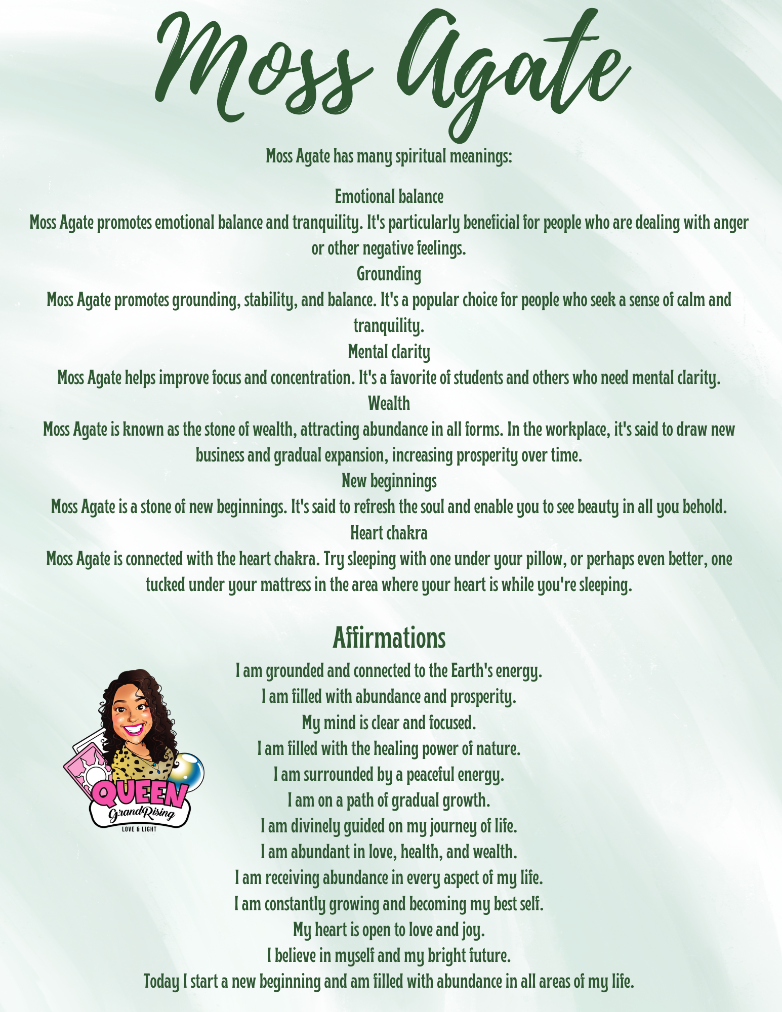 Moss Agate is the stone of new beginnings, grounding you in peace while gently guiding transformation. It soothes the emotional body, relieves stress, and connects you deeply with natureโs rhythms. Known to attract abundance and support healing, itโs beloved by healers, gardeners, and empaths alike. Moss Agate teaches us that growth takes root in stillness. ๐ฑ๐ชท๐ง๏ธ