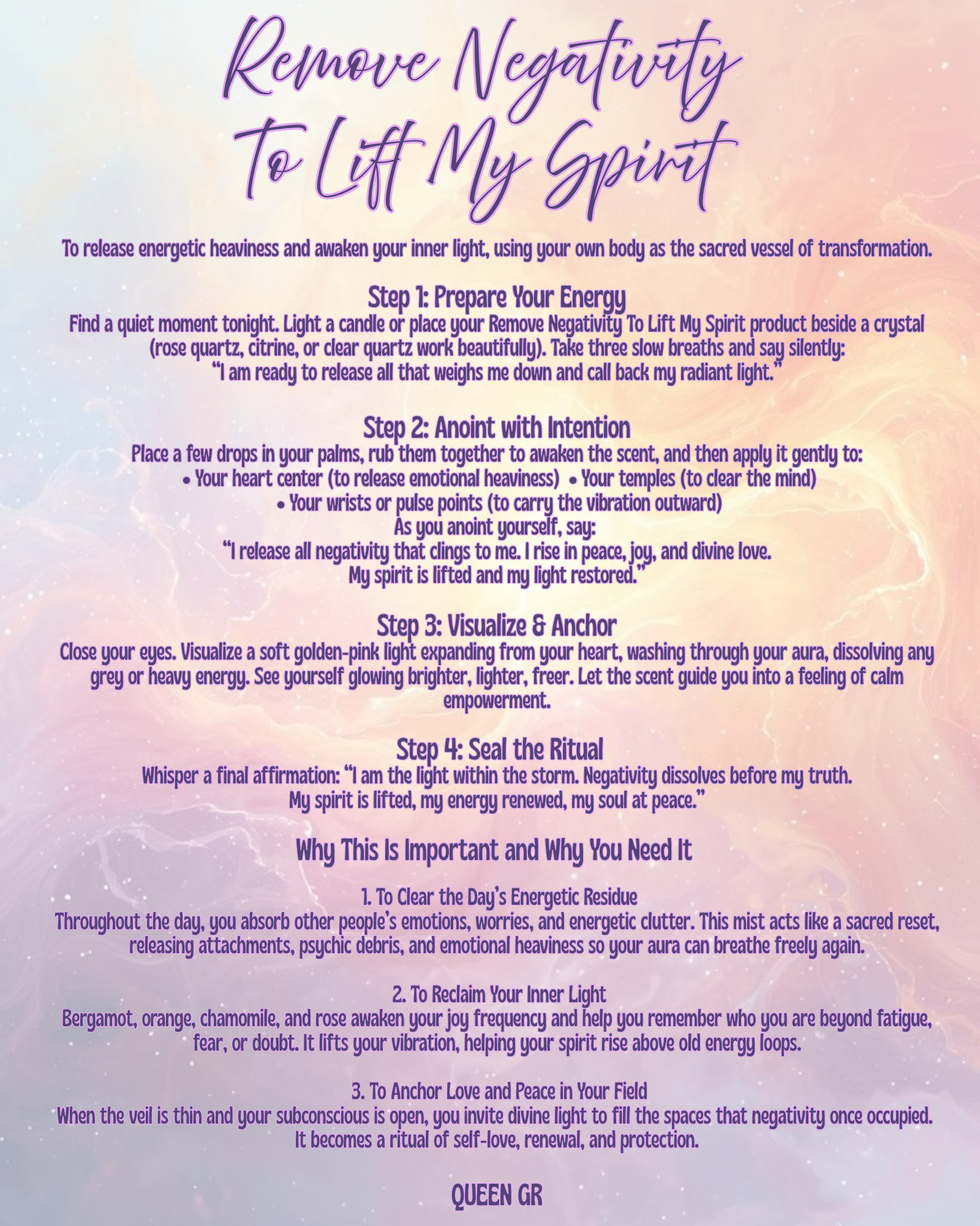 The Remove Negativity To Lift My Spirit Collection is a sacred detox for the soul, an energetic reset that clears heaviness, dissolves stagnation, and restores your inner light. Designed to cleanse your aura and uplift your vibration, this collection helps you rise above doubt, fear, and energetic clutter so you can return to your natural state of clarity, confidence, and radiant peace.
