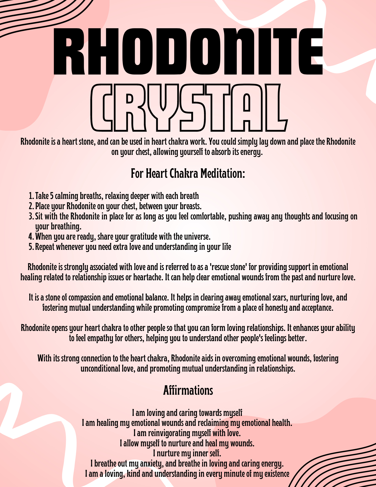 Rhodonite is the stone of emotional healing and radical self-love. It activates the heart chakra, dissolving wounds from the past and guiding you into forgiveness, balance, and emotional sovereignty. Known as a healerโs stone, itโs ideal for those navigating grief, heartbreak, or inner-child work. Rhodonite doesn't just soothe it empowers. ๐น๐ซ