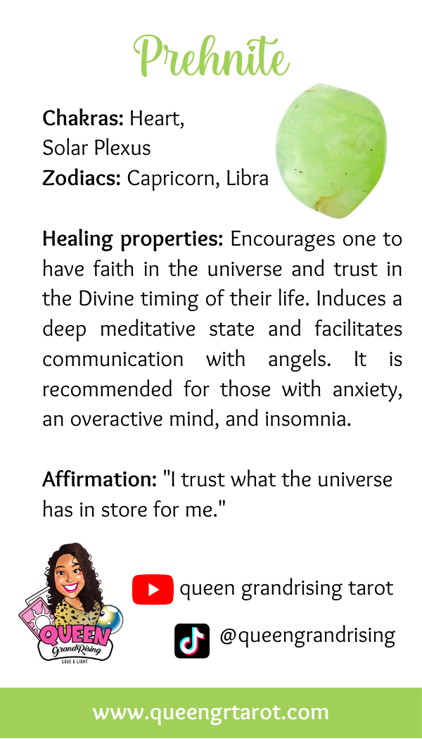 Known as the stone of prophecy and unconditional love, Prehnite is a bridge between the physical and spiritual realms. This heart chakra crystal opens you to angelic presence, supports deep healing, and reminds you that you are always divinely held.